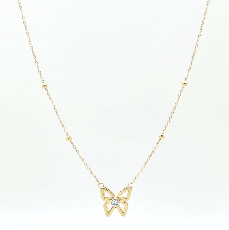 خرید گردنبند طلا پروانه با طراحی مینیمال و طلای ۱۸ عیار، ساخته شده در معتبرترین کارگاه تهران. زیورآلات ظریف و خاص برای هر سلیقه.