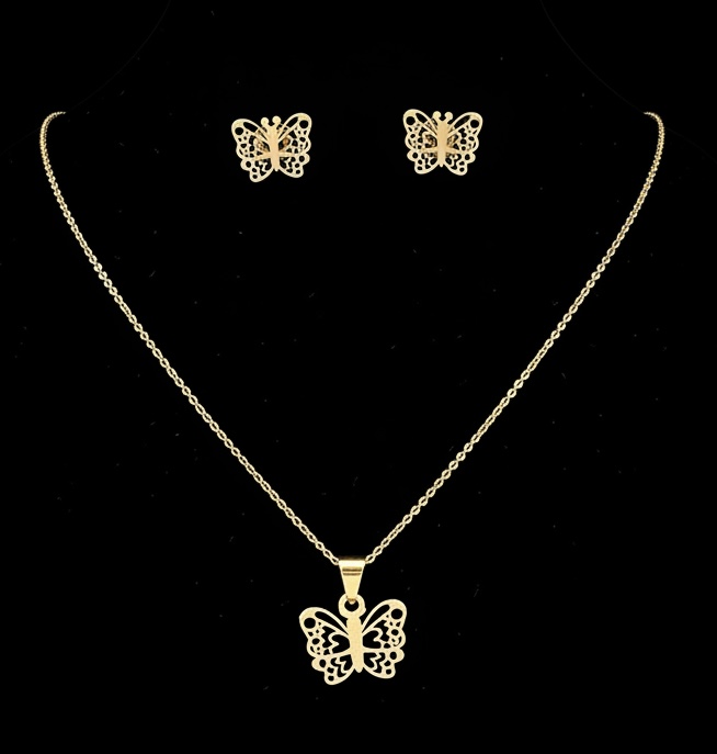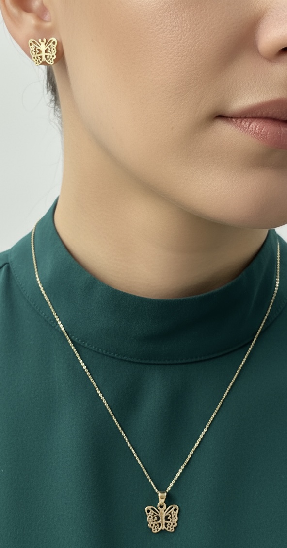 نیم ست طلا پروانه با طراحی مینیمال از طلای ۱۸ عیار، زیبا و منحصر به فرد، ساخته شده در معتبرترین کارگاههای طلا سازی تهران.